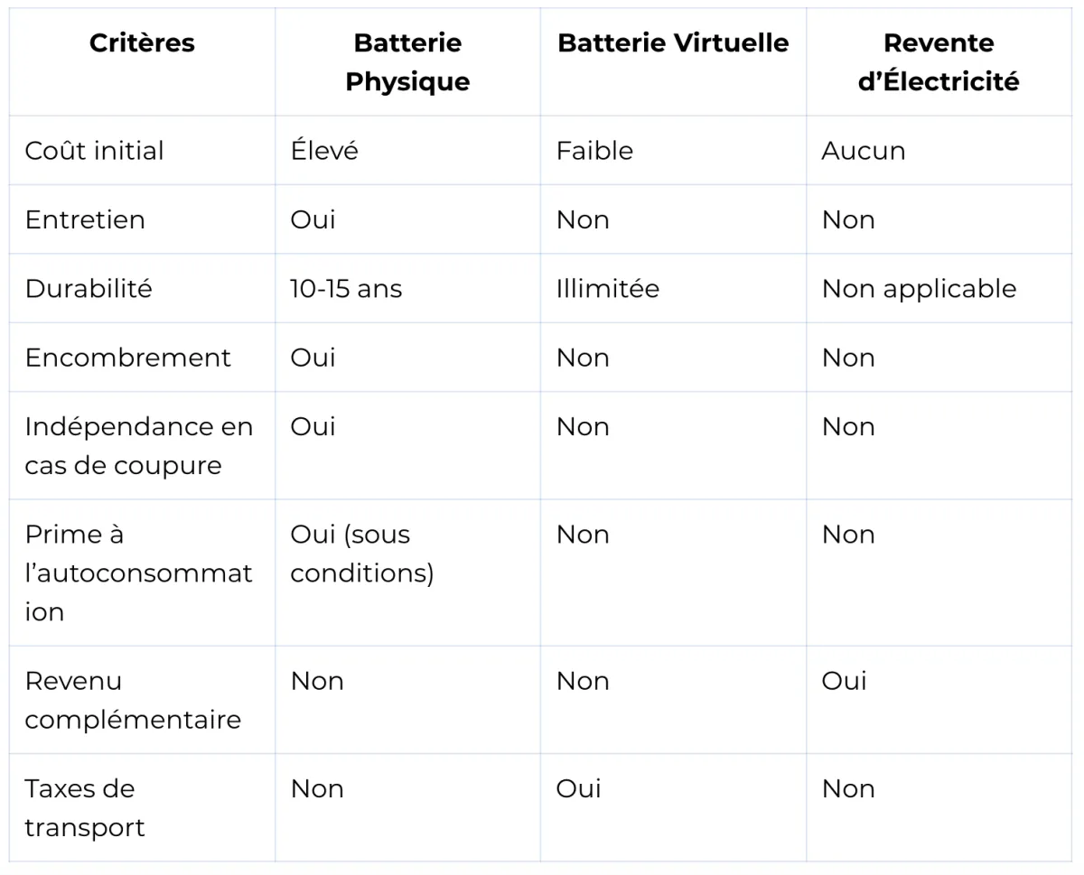 Avant de vous lancer, il est crucial de comprendre chacune des options disponibles. Vous avez trois principales solutions : la batterie physique, la batterie virtuelle et la revente de l'électricité produite.